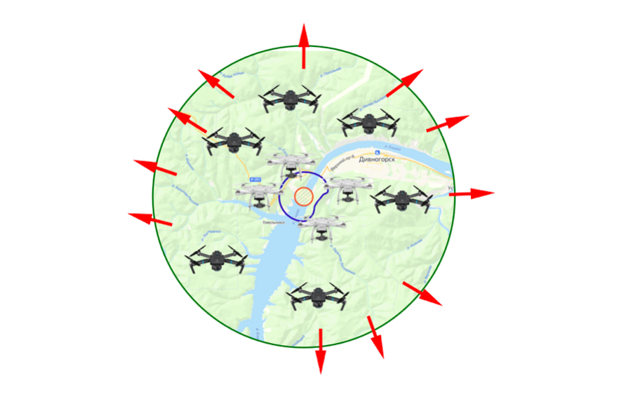 Если размеры объекта превышают дальность работы РЭР (диаметр 10 км), то следует установить дополнительную точку обнаружения и подавления БПЛА (дальность высококачественного РЭБ - 2 км в диаметре при запуске противником дрона с расстояния 10 км) .